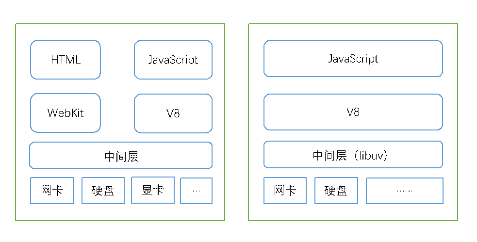 除了HTML、WebKit和显卡这些UI相关技术没有支持外,node的结构与Chrome非常相似。它们都是基于事件驱动的异步结构,浏览器通过事件驱动来服务界面上的交互,node通过事件驱动来服务I/O。在node中JavaScript可以随心所以地访问本地文件,可以搭建websock服务器端,可以连接数据库,可以像web wokers一样玩转多进程。