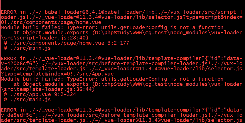 更新插件,之后出现了一长串惊心动魄的红色,开始了我悲惨的踩坑之路:)cnpm install vue-loader vue-template-compiler loader-utils